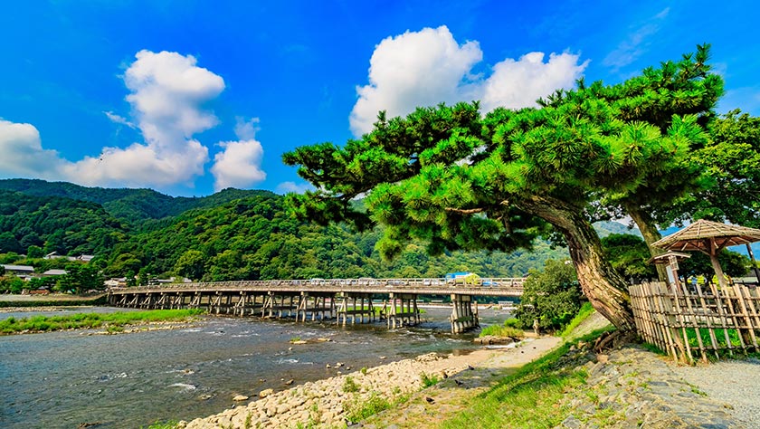建於9世紀前葉的平安時代,曾多次遭洪水沖毀後重新建造。據說因鎌倉時代的龜山天皇乘船賞月時,詠歎月亮看起來宛如正在過橋般地移動而得名。渡月橋曾出現在歌川廣重和葛飾北齋等人的浮世繪作品中,已成為嵐山最具代表性的風景。
