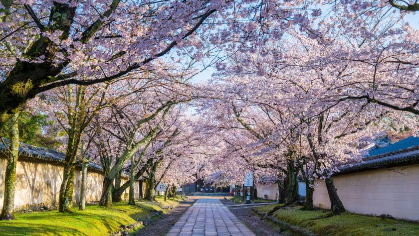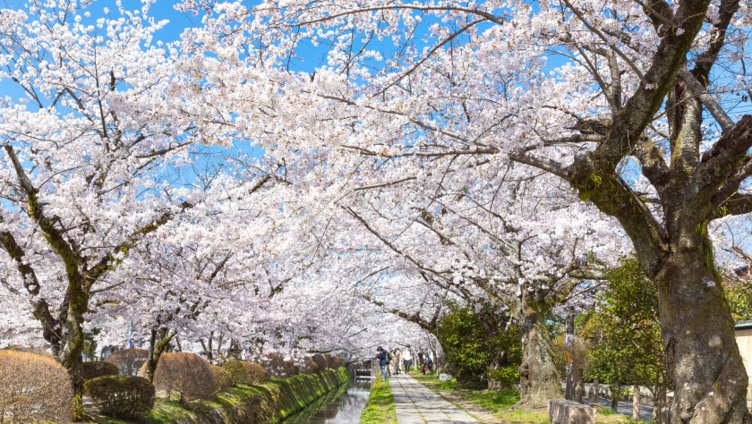 哲學之道是一條全長2公里的散步小徑,從「銀閣寺」綿延至「熊野若王子神社」。因哲學家西田幾太郎每天早上來這裡散步冥想而得名。每年3月下旬至4月上旬期間,疏水沿岸以染井吉野為主,還有大島櫻、八重櫻、枝垂櫻等,多達約400棵的櫻花盛開綻放;是京都數一數二的知名賞櫻勝地。滿開時會形成美麗的櫻花隧道,令造訪的遊客無不沈醉其中。