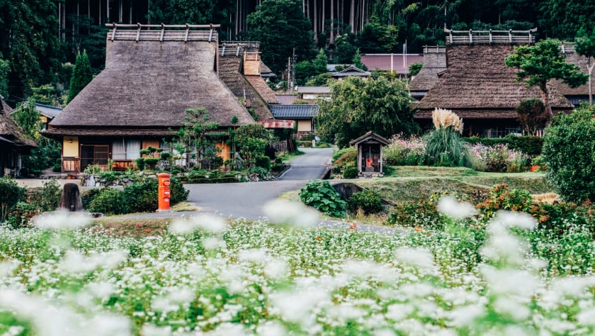 被群山環抱的美山茅草屋之鄉,約50戶民家中有39戶為茅草屋頂,保存150~200年前傳統木造建築,被指定為國家重要傳統建造物群保存地區。與白川鄉、福島大內宿並稱日本三大合掌村,四季景致迷人,春櫻秋楓宛如日本原景畫卷。