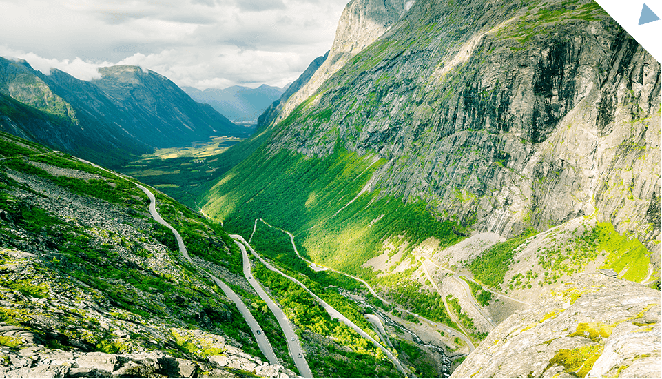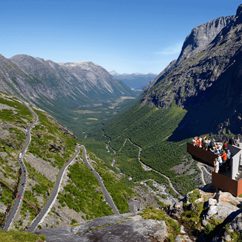 傳說侏儒精靈就住在這片峭壁森林裡,挪威政府耗費 鉅資,順 著峽灣環繞著崖壁開鑿完成的一條公路,最精采路段由 11 個髮夾 彎組成,一側是壯麗 的飛瀑、另一側則是陡峭的懸崖,穿越蜿蜒曲折的冰河峽谷與翠綠的峽灣,飽覽原始 的大自然之美。