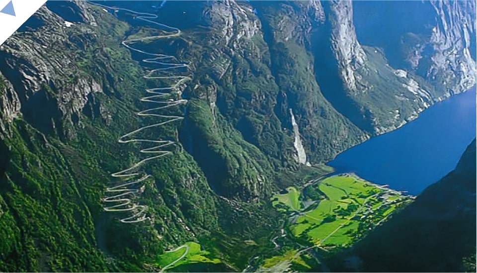 挪威國家精選18條景觀公路之一,常有 老鷹盤旋於峽灣上方而得名,狹 窄的道路建在險峻的斜坡上,形 成 12 個驚險的髮夾 彎道,佇立老 鷹之路的觀景台為俯瞰世界遺產 - 蓋倫格峽灣最佳地點,眼下壯麗 的海景與華麗的遊輪融合成最美 的一幅畫。