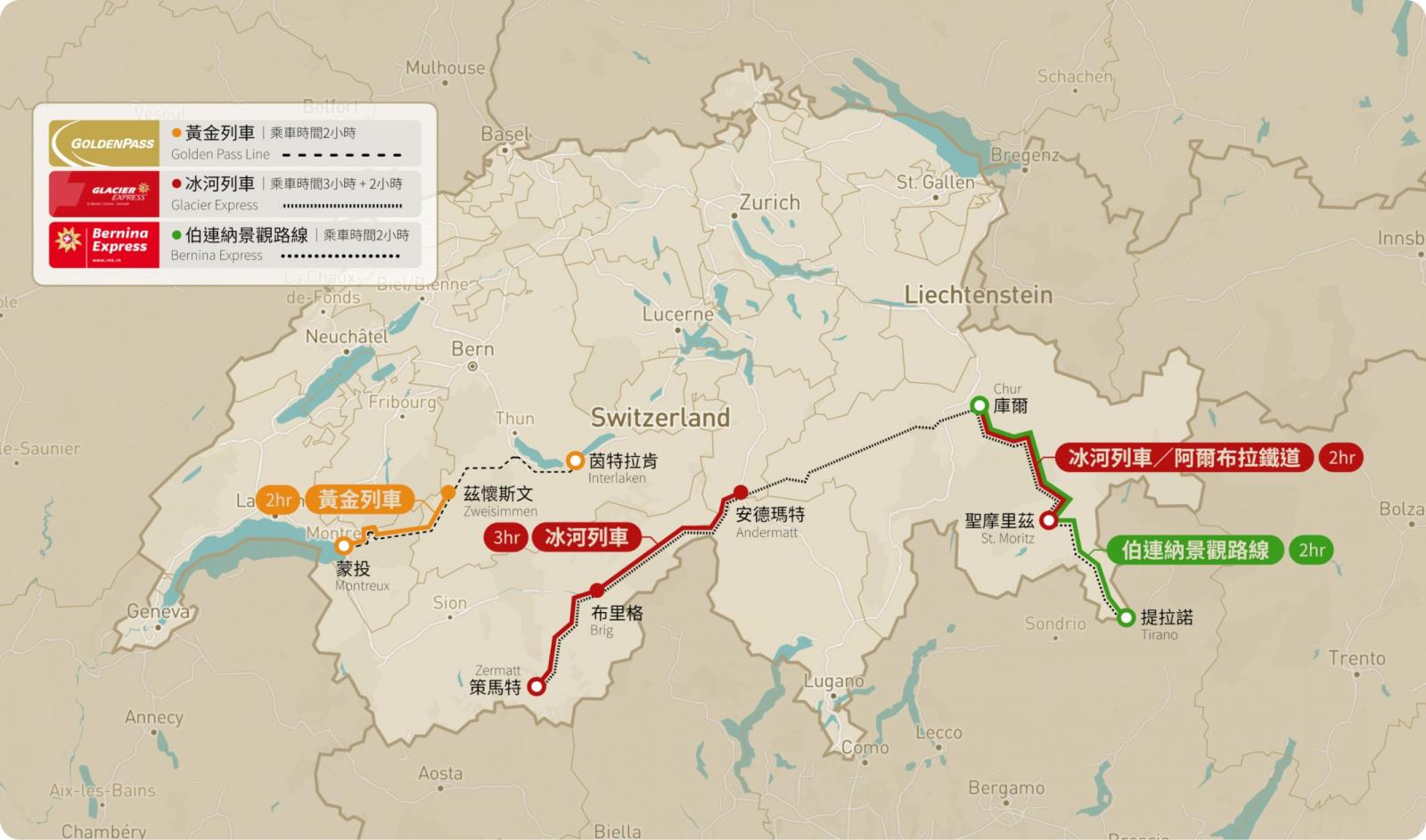 是由雷塔恩鐵路與馬特洪哥達列車兩家鐵路公司所共同營運,從聖摩里茲到策馬特全程8小時,其中2小時路程與阿爾布拉鐵道路線重疊,長安所安排的行程「分天分段搭乘」,結合阿爾布拉線並搭乘安德馬特到策馬特冰河列車,涵蓋冰河列車全線三分之二以上的路線,不錯過冰河列車路線的沿途絕美景觀。