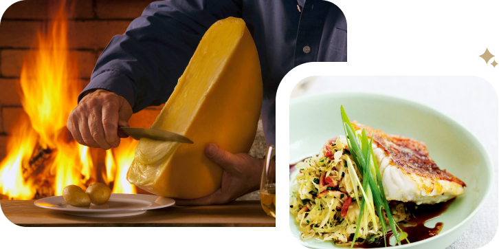 瑞士經典料理-火烤起司 Raclette,起司加熱融化後用刀刮下,直接放置預熱陶盤,起司下方有酥脆的口感,帶有些許鹹味與純香濃厚的牛奶味。
