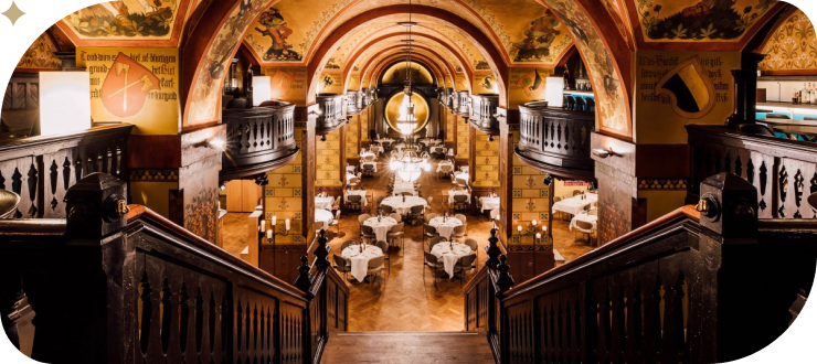 建於1718年的「伯恩地窖餐廳」,曾是市政廳存放稅糧的穀倉,現今已改成舉辦宴會、慶典的場所。暈黃的光線,烘托出地窖獨特的穹拱;搖曳的燭光配上秀色的餐點,彷彿回到中古世紀的時光,高貴優雅。