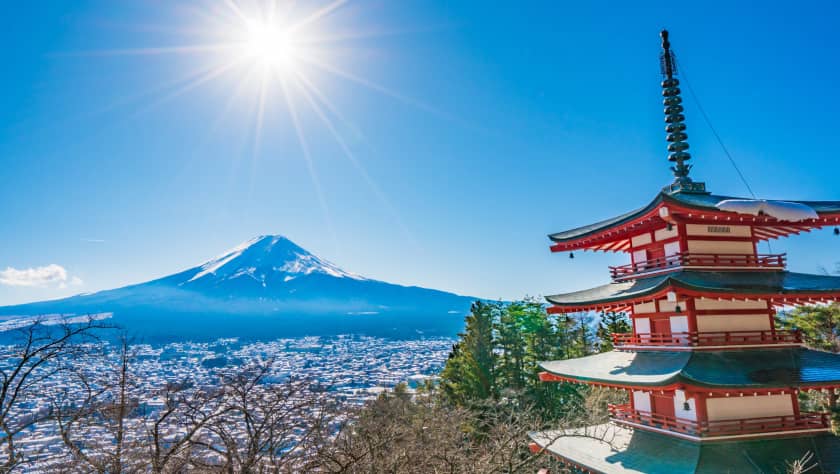 新倉山淺間公園可說是眺望富士山的絕佳地點,特別以能同時捕捉富士山、冬季雪景與五重塔(忠靈塔)的經典構圖聞名。公園內設有約400階的「和平之階」,登頂後視野遼闊,在四季皆展現不同風貌:春賞櫻、夏觀林、秋逐楓、冬見雪,也被譽為日本風景代表地之一。
