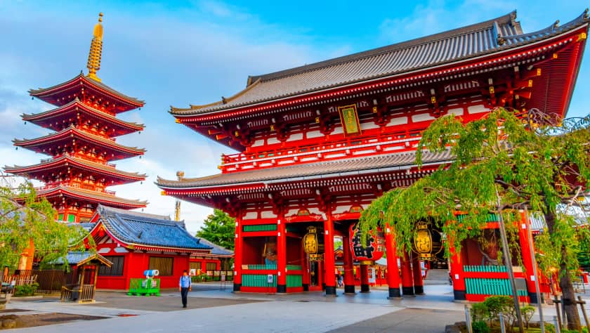 淺草寺是東京最古老的寺廟。象徵淺草的「雷門」懸掛著巨大的紅色燈籠,兩旁有「雷神」和「風神」雕像。這裡不僅是宗教聖地,也是東京最具代表性的文化景點之一,提供豐富的傳統體驗。寺內的五層塔和大型門戶,以及周圍的傳統商店街,讓遊客在探索東京的同時,感受其深厚的歷史與文化。